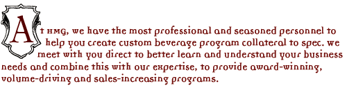 The pos you display in your establishment is a direct reflection upon your business. Our artists specialize in food and beverage programs and provide you with professional quality design every time. Why settle for poor quality, unattractive and bland pos, when you can have custom, creative and professional pos from HMG.